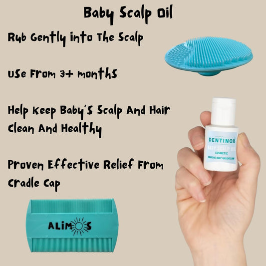 Dentinox Baby Scalp Oil Bundled with Alimos Cradle Cap Silicone Brush & Fine Tooth Comb ? Moisturises & Nourishes Dry Skin ? With 6 pack Bamboo Baby Wipes ? 3 Months & Upward (30ml)