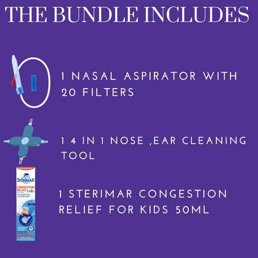 Sterimar Congestion Relief for Kids 50ml Bundled with Alimos Nasal Aspirator, Snot Sucker Suitable for Newborns and Babies with 20 Filters & Nose Picker 4-in-1 Tool