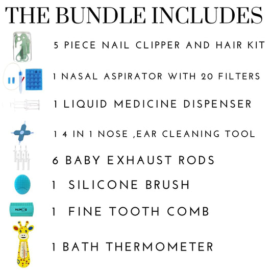 Alimos Newborn Baby Grooming & Healthcare Bundle with Nasal Aspirator & Hygiene Filters , Nose, Ear Picker,Nail Clippers,Cradle Cap Brush ,Gas and Colic Reliever ,Medicine Dispenser & Bath Thermometer