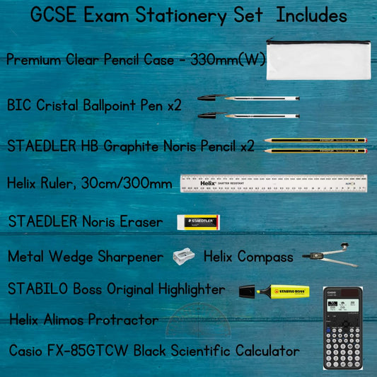 Alimos GCSE Complete Exam Stationery Bundle Set Bundled With Casio Black FX-85GTCW Scientific Calculator, Geometry Set & Clear Exam Pencil Case For Maths Exam