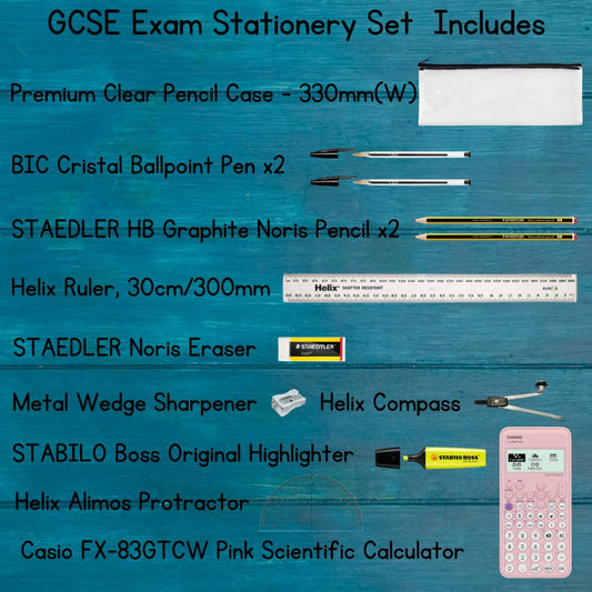 Alimos GCSE Complete Exam Stationery Bundle Set Bundled with Casio Pink FX-83GTCW Scientific Calculator, Geometry Set & Clear Exam Pencil Case for Maths Exam