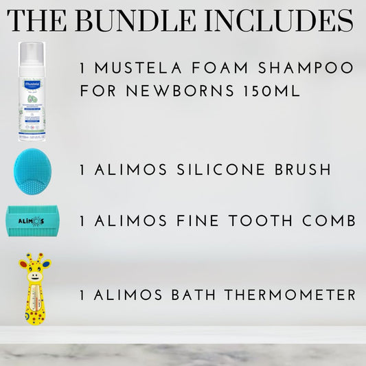 Cradle Cap Foam Shampoo For Newborns 150ml Bundled With Alimos Baby Bath Silicone Brush & Fine Tooth Comb And Bath Thermometer