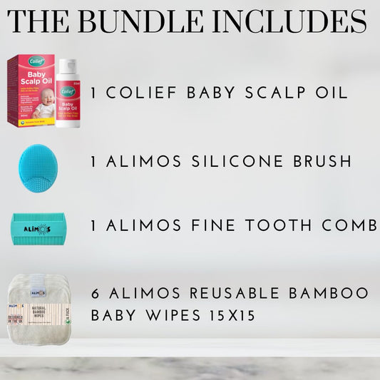 Colief Baby Scalp Oil Bundled with Alimos Cradle Cap Silicone Brush & Fine Tooth Comb ? Moisturises & Nourishes Dry Skin ? With 6 pack Bamboo Baby Wipes 15x15 ? 3 Months & Upward (30ml)
